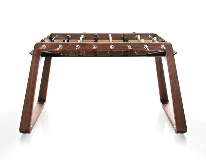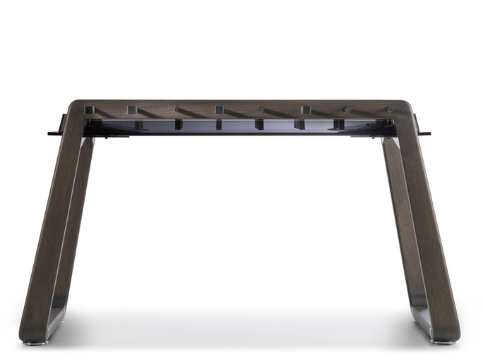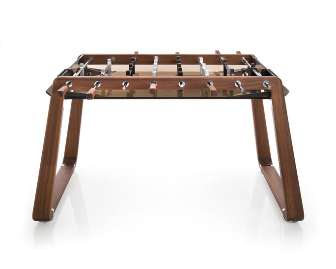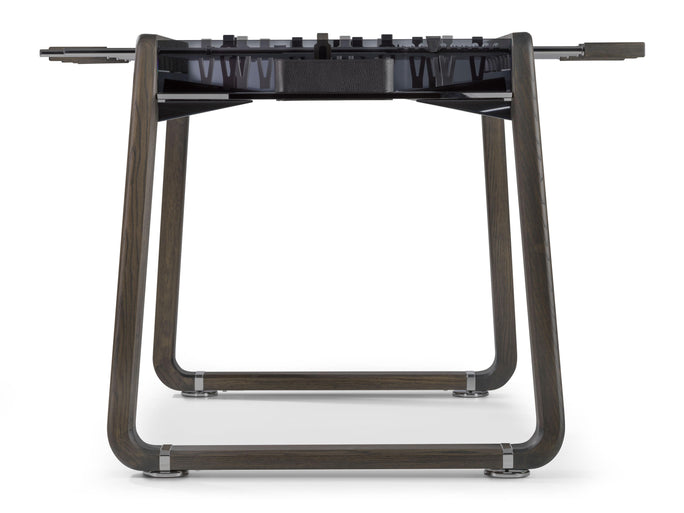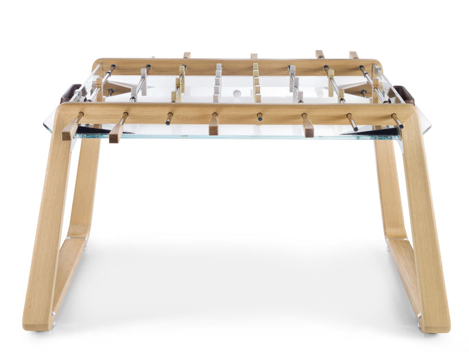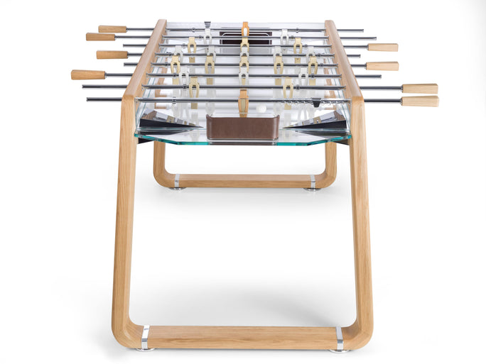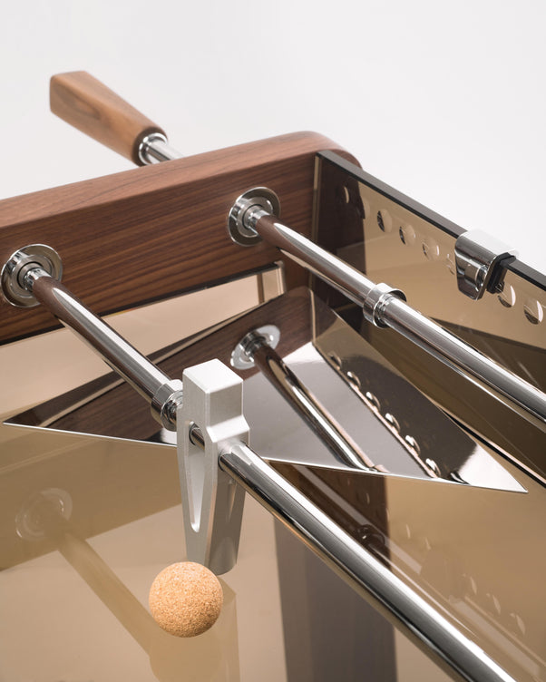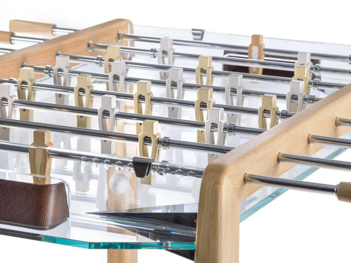The refined piece features a crystalline glass playing field, supported by a refined solid wood structure. Modern design touches such as geometric handles and sublime metal details allow Derby to elevate the game of table football to new heights, achieving an elegant balance between contemporaneity and the renowned excellence of Italian craftsmanship.