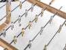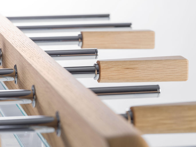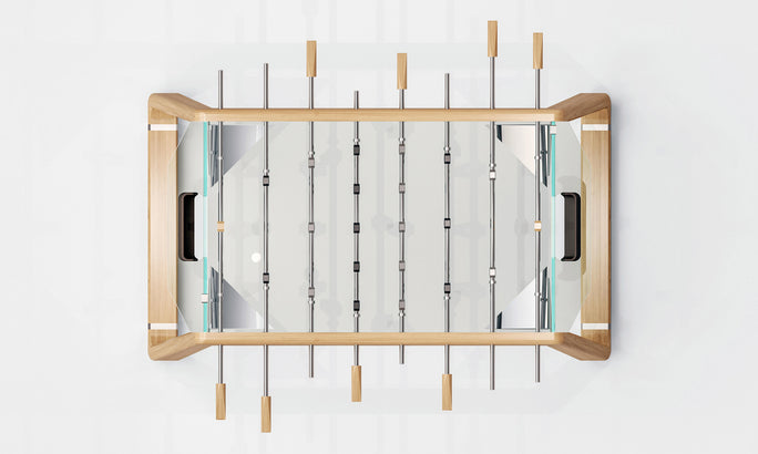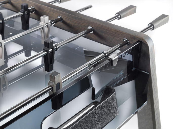 Transform your game room into a luxurious retreat with our Derby Wood Foosball table. Featuring premium craftsmanship and a sleek design, this sports centerpiece elevates any space. Indulge in the art of competition with a touch of sophistication. The Derby collection is a visionary foosball table with glass top that dedicates itself to Italy, especially to the city of Milano where the game of football holds great prominence; presenting a modern reinterpretation made with meticulous care through the highest exponents of Italian craftsmanship. The Derby di Milano is a contemporary foosball table with glass top, crafted from a harmonious blend of premium materials.