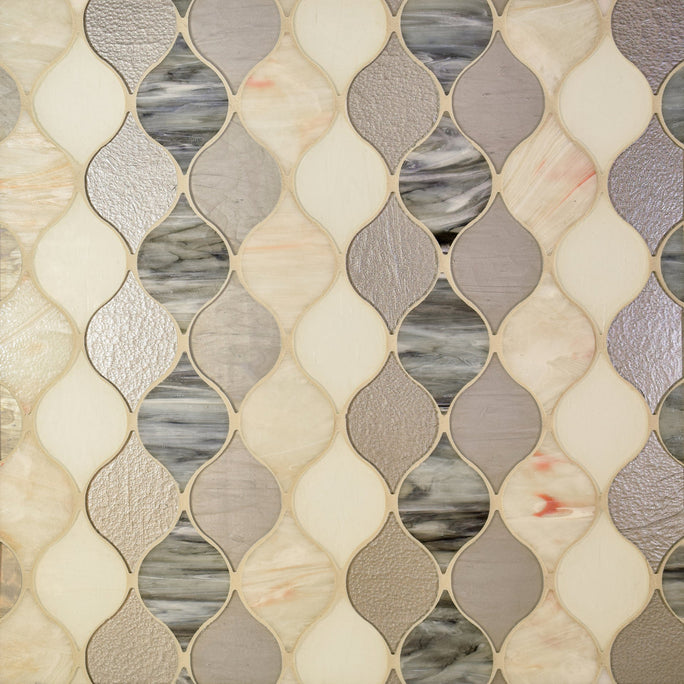 Fused, colored and transparent drawn glass mosaic, obtained with the craftsmanship working of a glass slab with the application of a silver foil back side, waterjet cut. Composed with 25% quality materials, pre-consumer recycled glass and 75% post-consumer recycled glass.