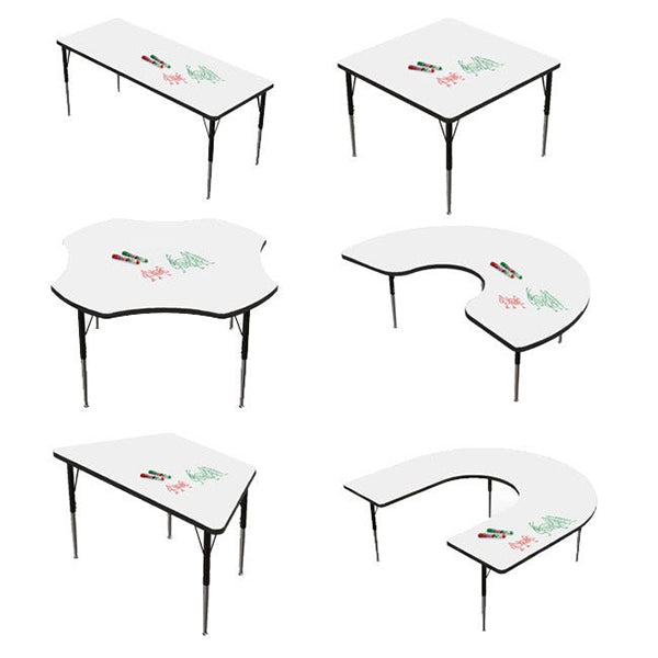 Form, function and creativity combine with dry erase activity tables. The durable dry-erase HPL surface allows your students and staff to imagine their imagination while helping them get more done, using the unique table shape for impromptu collaboration or brainstorming sessions. Other features include quick assembly, adjustable heights between 22″ and 29″, and optional teen height inserts that adjust the table between 16″ and 23″ for younger students. Multiple edge colors allow this table to blend into different types of learning and corporate environments.