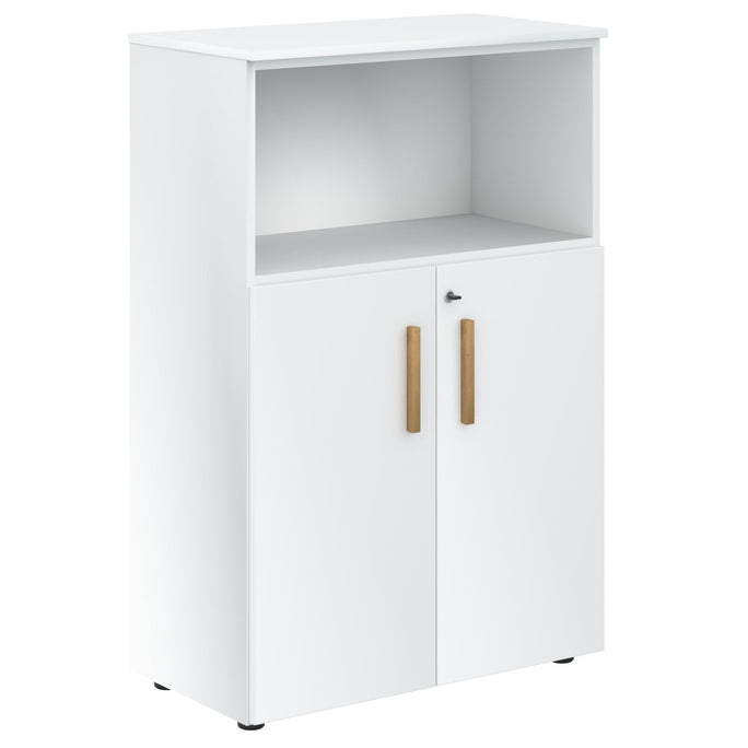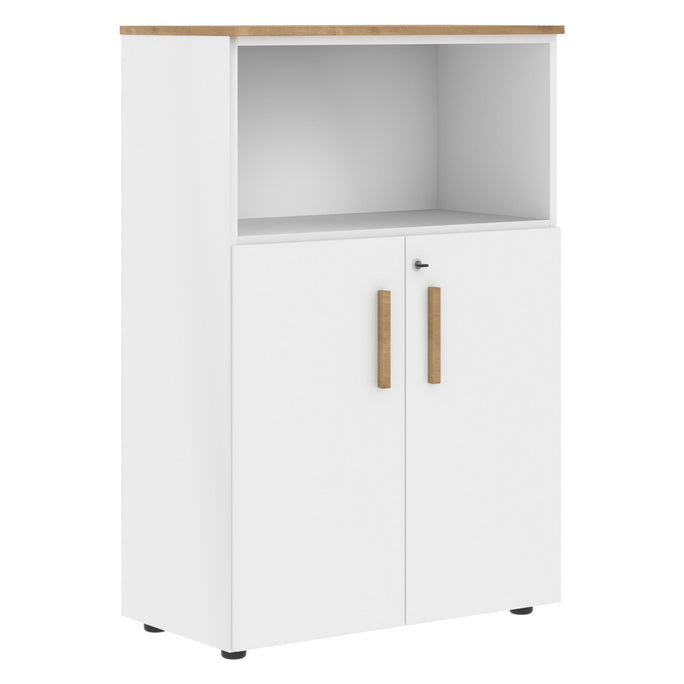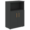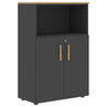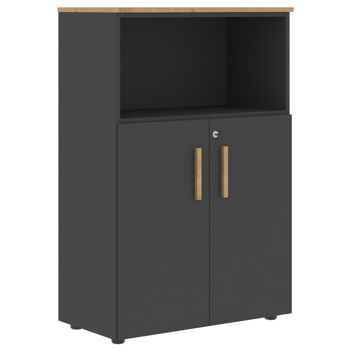 EXECUTIVE MEDIUM HEIGHT CABINET, MADE IN E1 LAMINATE CHIPBOARD, WITH OPEN SHELF AND WOODEN SWING DOOR