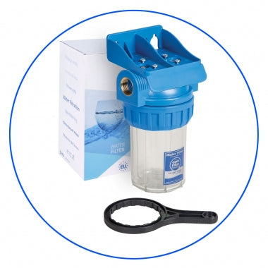 Overview:5” in-line set: three-part filter housing, with pressure relief valve and transparent sump, mounting bracket with screws, wrench and color box. Available with brass inserts: 1/2", 3/4" or 1" BSP.FHPR5-12-WB - 1/2"FHPR5-34-WB - 3/4"FHPR5-1-WB - 1"