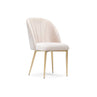 A contemporary dining chair in grey fabric with ribbed cushioning. Sits on a gold-finished base with a half-circle front design for stability and style.
