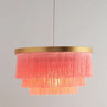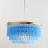 A contemporary LED pendant light for dining room, bar, or kitchen decoration. Elegant iron and fringe materials with 3-year warranty and 50000-hour lifespan. Available in white, blue, red, or grey. Control with a switch. Perfect for living rooms, hotels, home offices, or other exclusive spaces.