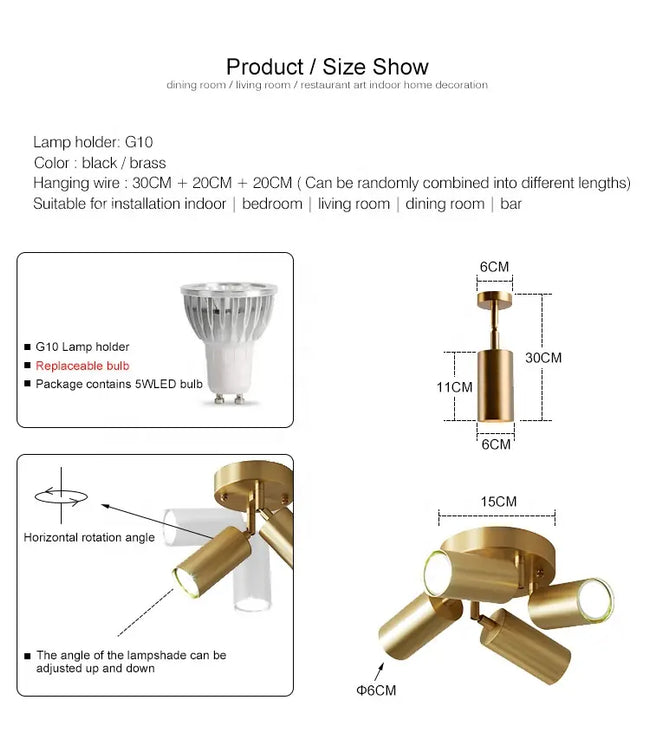 Modern LED pendant light with adjustable angle for bedroom, available in different head configurations. Made of iron and aluminum with a 3-year warranty. Choose from soft warm white color temperature and switch control. Nordic style in brass with LED spot light.