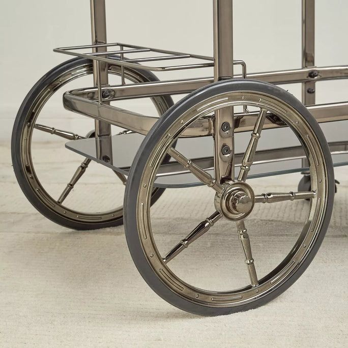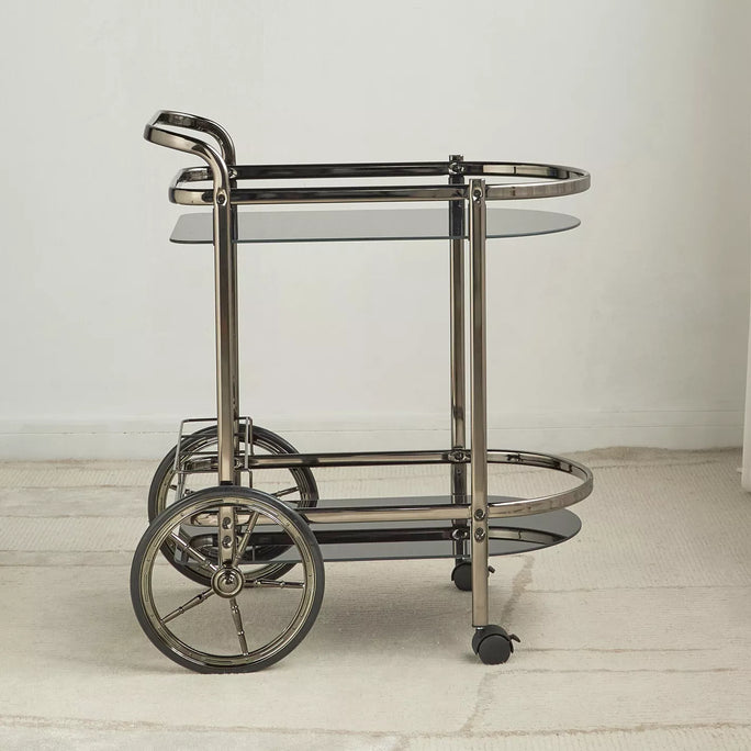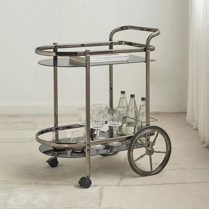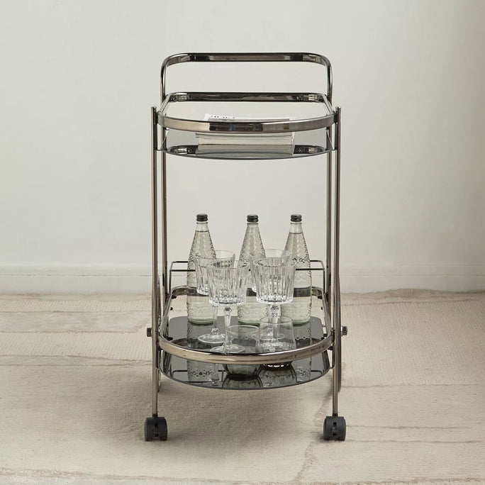 Elegant and functional, the Notica Serving Trolley brings modern style to serving and storage. Crafted from durable metal with a sleek metallic finish and complete with a clear glass top, it's designed to enhance your kitchen, dining or bar tea.