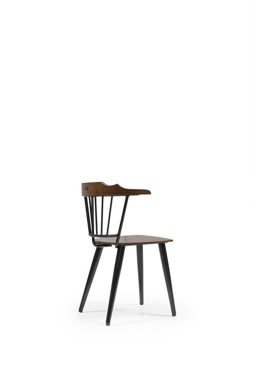 Dark wooden seat/back | Black spindle backrest | Sturdy minimalist style | Straight tapered legs | Durable café/dining chair