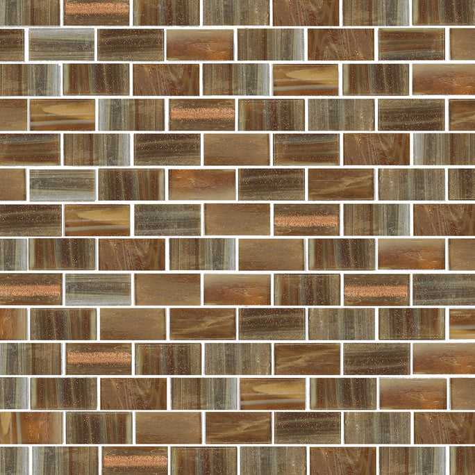Semi-transparent molten glass mosaic tesserae, enriched with sparkling enamels and aventurina stone. The mixing of two glass colors allows us to achieve the classic veining effect on the surface. Aventurina is an artificial stone produced by the fusion, at approx. 1200° C, of silica sand, copper and color components.