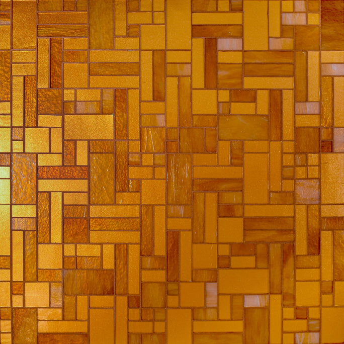 Fused, colored and transparent drawn glass mosaic, obtained with the craftsmanship working of a glass slab with the application of a silver foil back side, hand-cut. Composed with 25% quality materials, pre-consumer recycled glass and 75% post-consumer recycled glass.
