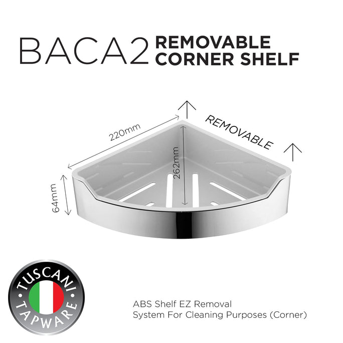 Removable Internal Shelf (Grey) for Easy Cleaning COLOURMatte Grey (Internal Shelf) | Chrome (Sides) MATERIALABS Plastic (Internal Shelf) | Stainless Steel (Sides) TECHNICAL SPECIFICATION300 X 220 X 64 MM Maximize space and convenience with our removable corner shelf. A sleek, modern design with premium materials, this shelf is stain-resistant for easy cleaning and built to last. Add functionality and style to your bathroom with ease.