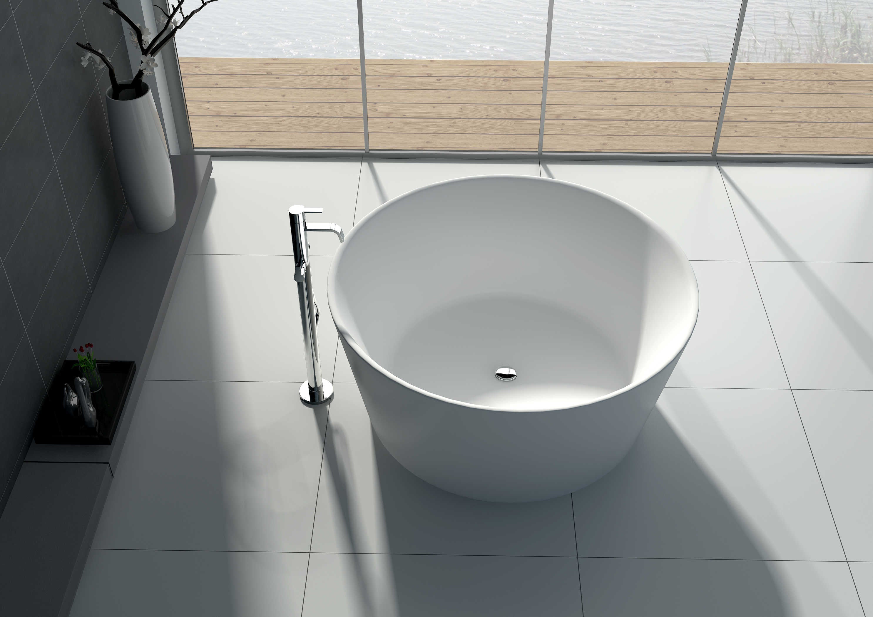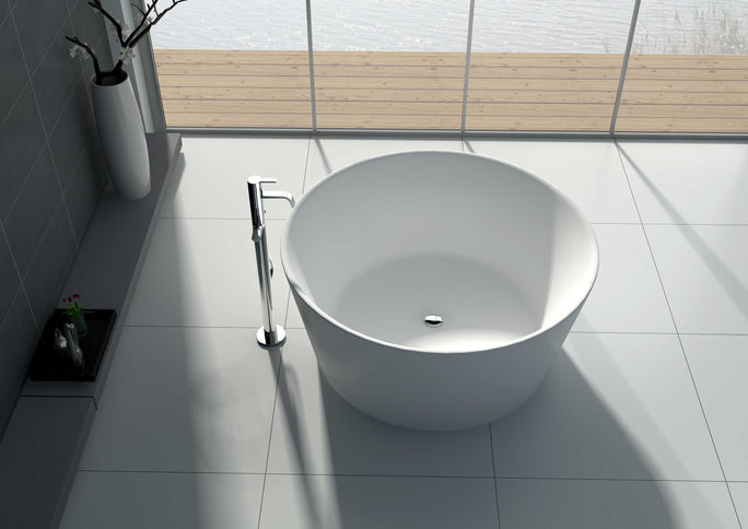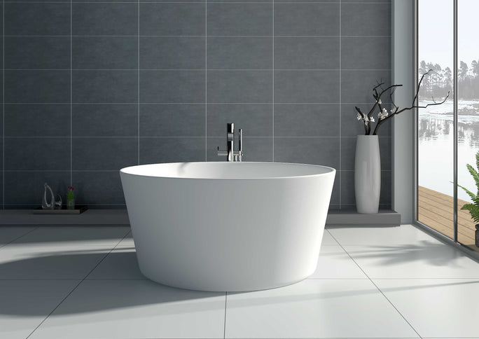 The Freestanding Bathtub JZ8626 blends soft curvature with structural confidence. Its elevated ends contour to the back for deep relaxation, while the solid surface body provides superb thermal stability. The smooth matte exterior works beautifully with both dark and pale floor tones. Usage idea: install on a raised marble plinth to define a spa zone within open‑plan layouts.