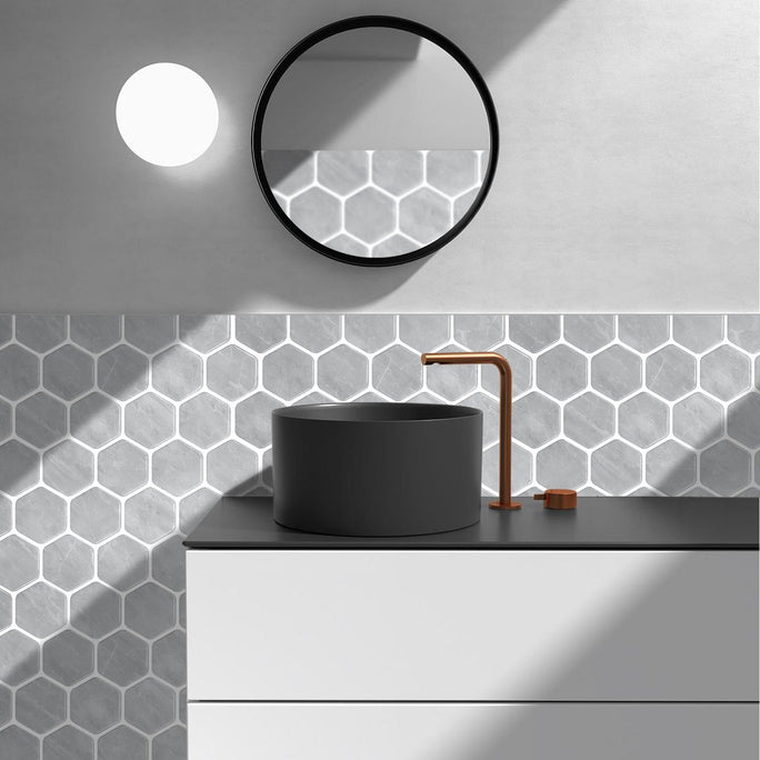 Step 3. Overlap the tiles and grout lines, peel off the backing, and stick them side by side for a seamless appearance.