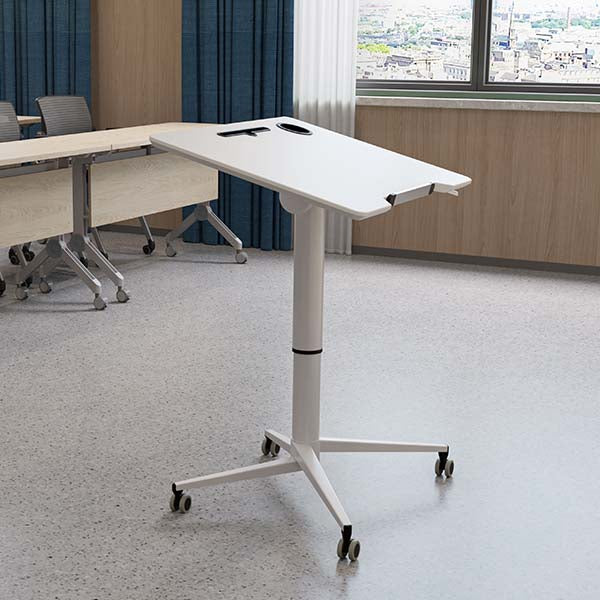 Hugo Height Adjustable Desk & Sit-Stand Table is a space-efficient, flexible, and versatile presentation tool and/or mobile workstation with a powerful pneumatic spring lift mechanism that makes transitions fast and easy, perfect for offices, homes, hospitals and showrooms. The table top can be tilted in infinite angles between 0 degrees to 90 degrees, allowing the user to tilt the desktop at an angle most suitable for him/her to read or write on. When not in use, they can be nested for best space-saving.