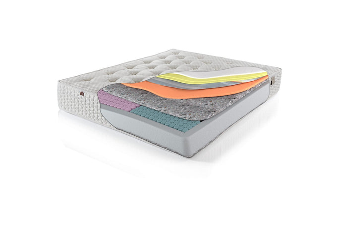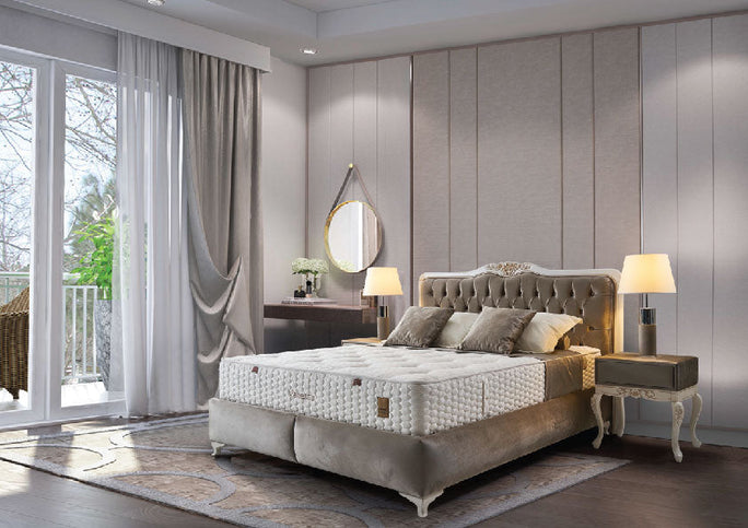 Vanessa that is produced completely as handmade a solution for different preferences of the partners as its one side is hard while the other is soft on the same surface. Viscose fabric, obtained