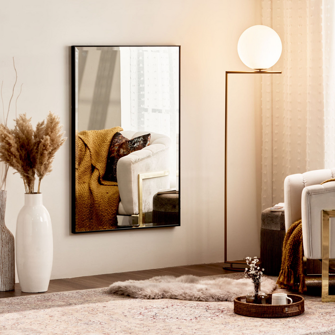 A bevelled rectangular wall mirror sized for above-console or dining placement, adding depth and light.