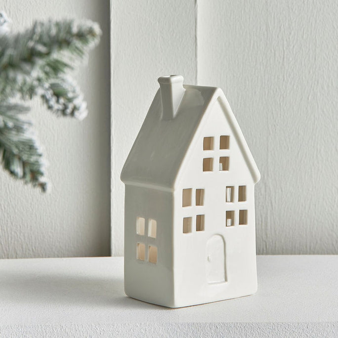 The Decorative LED Ceramic House adds a warm cosy glow to shelves and mantels. Crafted from smooth white ceramic, it emits gentle light through cut-out windows for a storybook effect. Perfect for mixing with garlands or votive candles to create depth and shadow. Compact enough for window ledges yet bright enough to serve as a stand-alone accent. Usage idea: arrange several sizes together to build a mini Christmas village scene.