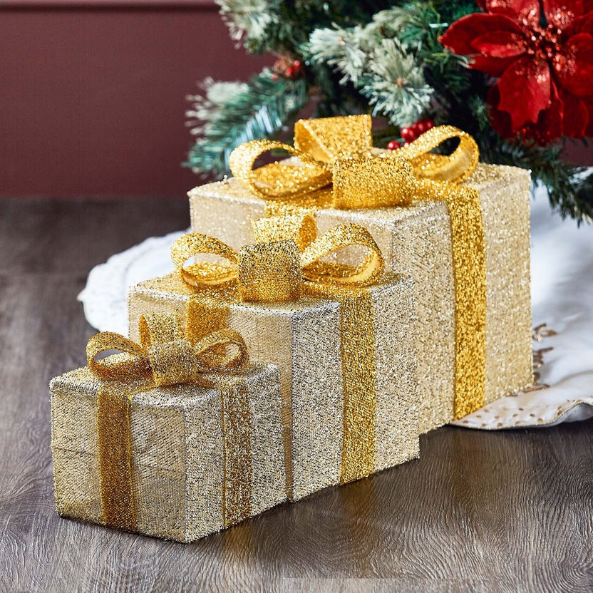 The Glittery 3-Piece LED Gift Box Set instantly brightens corners and entryways. Each box sparkles with embedded lights and a fine glitter surface that catches even soft ambient glow. The nested structure lets you stack or spread them for varied height arrangements. Durable frames ensure shape retention season after season. Usage idea: place beside the tree to extend the light display toward the floor.