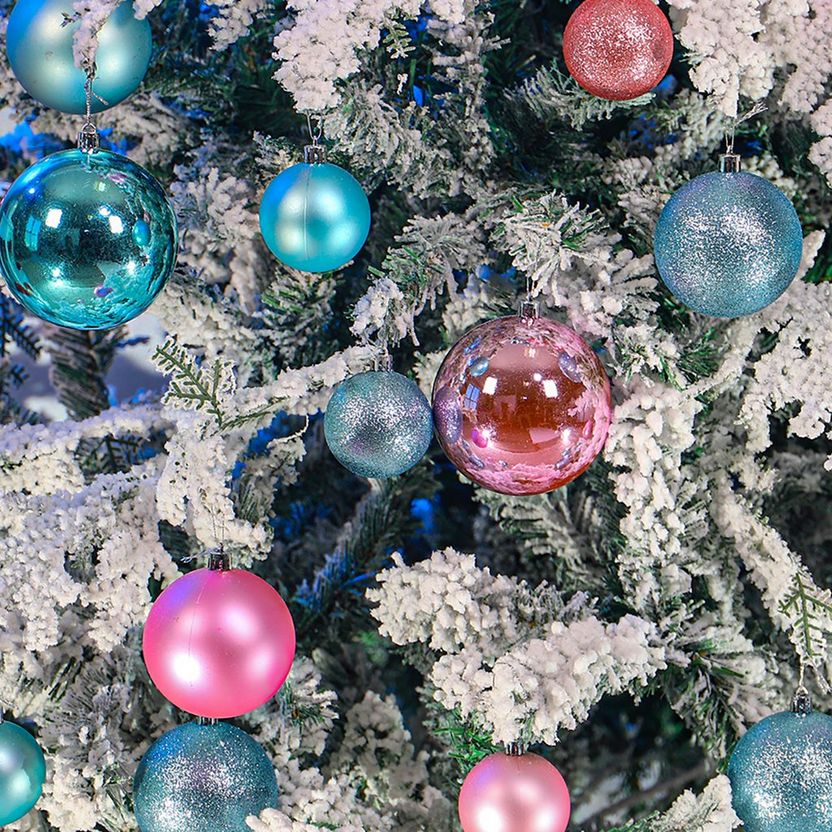 Snow-flocked finish; sturdy metal stand; plush branch density; easy to assemble