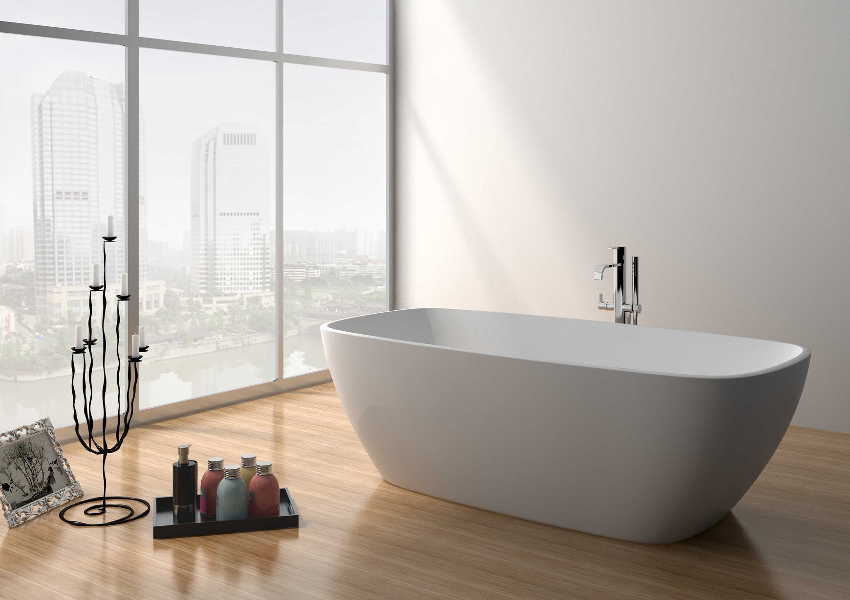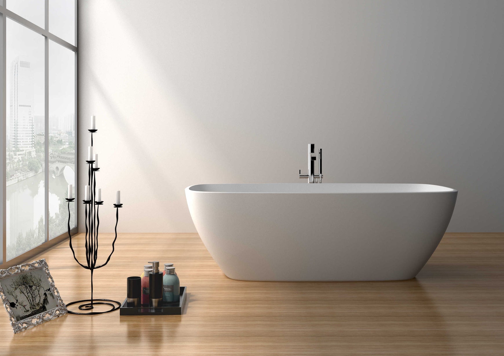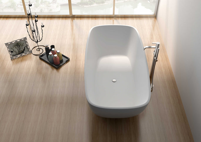 The JZ8631 freestanding tub is crafted with a subtle inner contour and even wall thickness for balanced aesthetics. Its deep cavity supports immersive soaking and comfort for two. The non‑porous matte surface resists stains and scratches while feeling velvety to the touch. Usage idea: complement with chrome or matte black floor‑mounted mixers for visual balance.