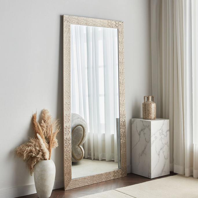 A slim-profile full-length leaner mirror with refined edging, perfect for bedrooms and dressing corners.