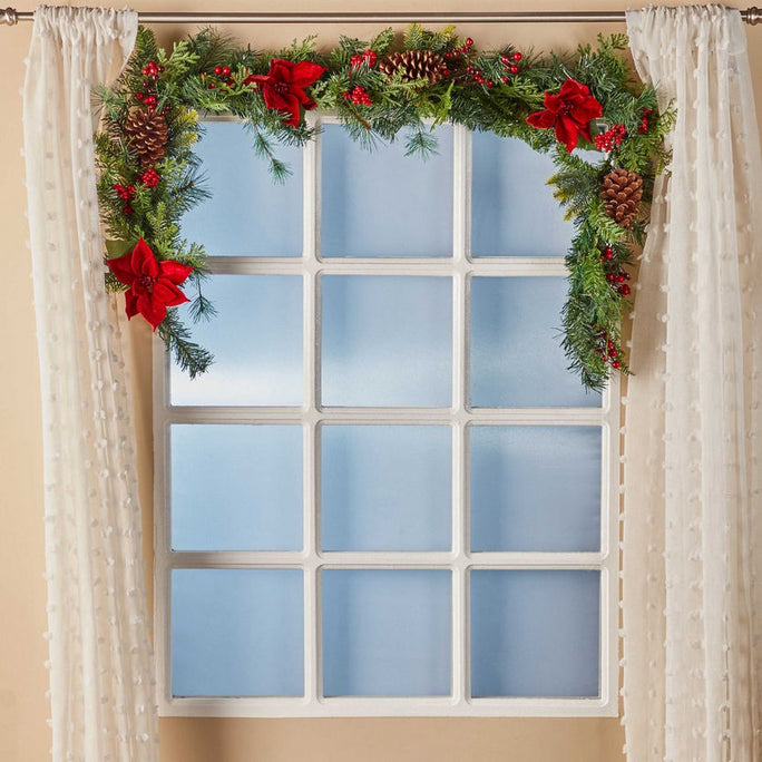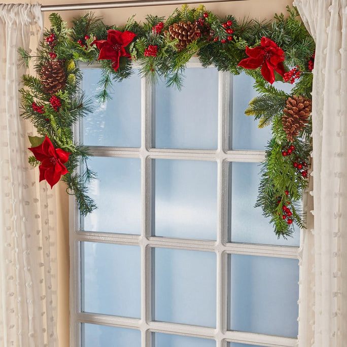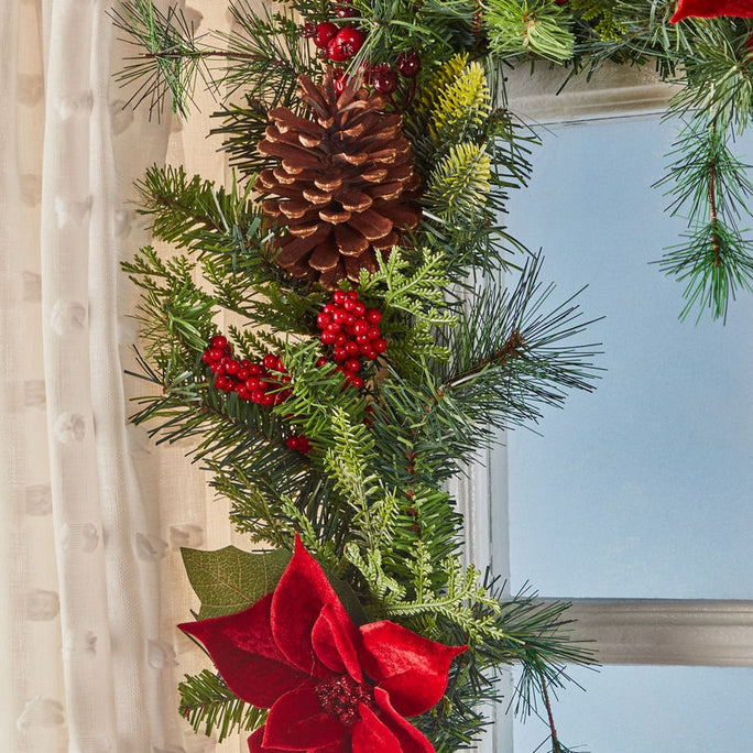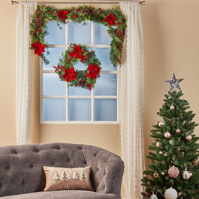 The Traditional Poinsettia Garland adds rich red and green vibrancy to stair rails, mantels, or door frames. Flexible wired stems make shaping easy, while lush poinsettia blooms provide festive texture. At 180 cm long, it offers generous coverage for a single surface or can be layered for fuller décor. Crafted for reusability, it maintains colour and form year after year. Usage idea: wind micro fairy lights through the garland to accentuate its crimson tones at night.
