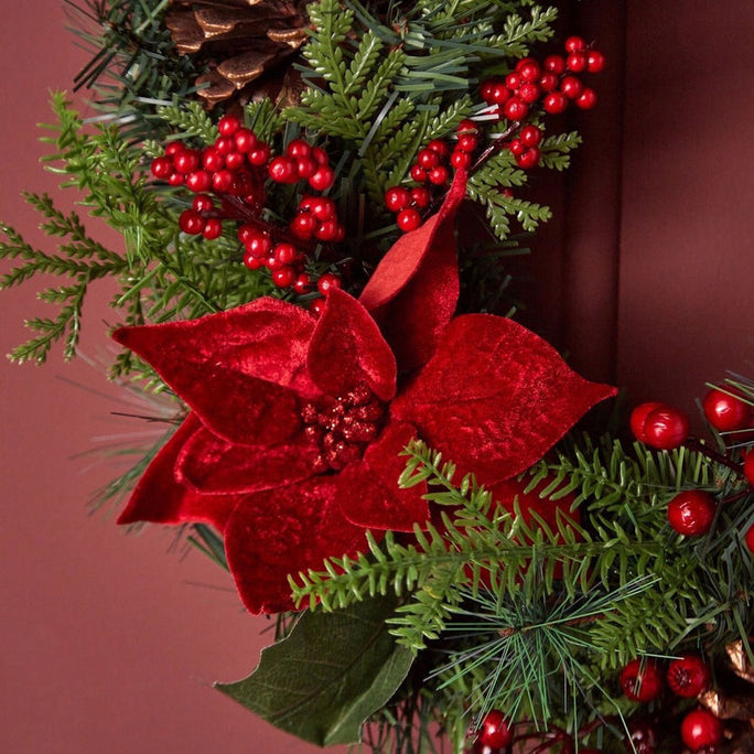 The Traditional Poinsettia Wreath adds timeless elegance to doors and mantels alike. Red poinsettia petals contrast against evergreen sprigs, while subtle golden detailing hints at festive luxury. The full circular arrangement gives instant impact without extra styling, making it effortless to display. Crafted for durability, it keeps its shape year after year. Hang it on your front door to greet guests or place it above a console for a welcoming accent. Usage idea: pair with matching garlands for a cohesive holiday scheme.