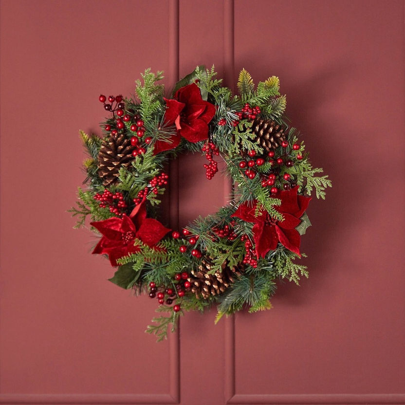 Faux poinsettia blooms; lush green foliage; pre-arranged circular form; easy hanging loop