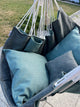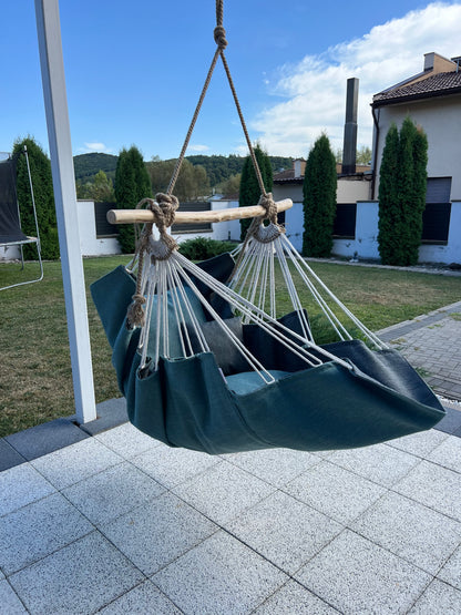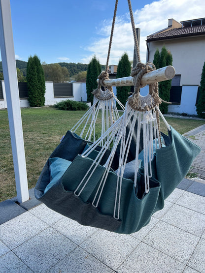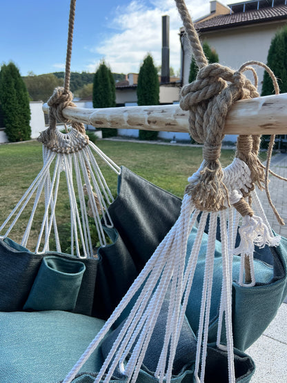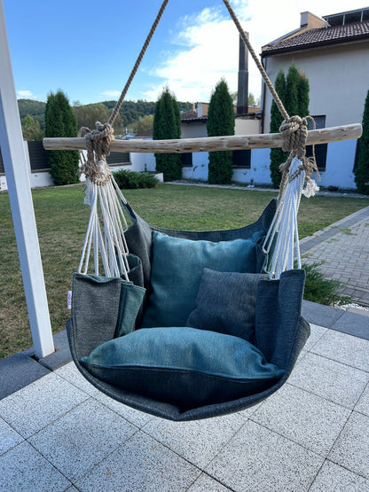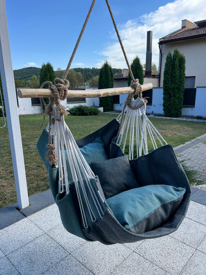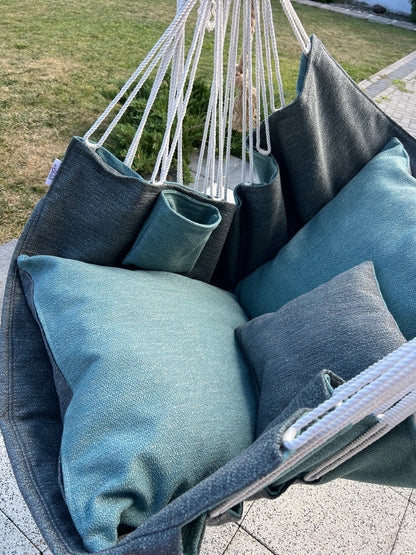 Hammock armchair 2 pillows with the dimensions of approx. 75cm x 75 cm1 removable cover for the 2 pillows1 pillow with the size of approx. 40cm x 40cm 1x 120cm hardwood beam randomly chosen 1x 6m long jute rope.