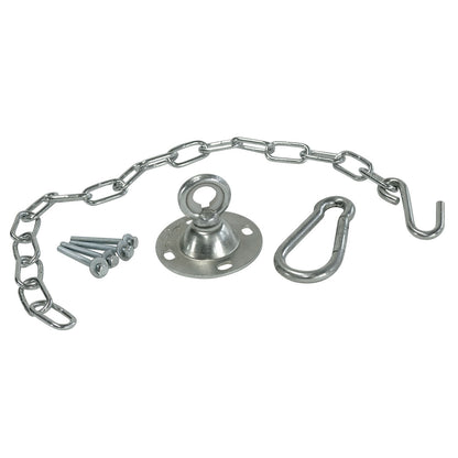 A special round ceiling hook with carabiner, chain and 4 screws for suspended armchairs, specially developed for installation in the house, terrace. It is rotating. All necessary accessories included in the kit:
