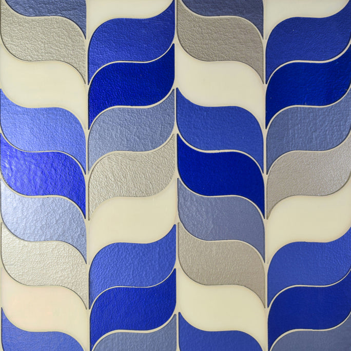 Fused, colored and transparent drawn glass mosaic, obtained with the craftsmanship working of a glass slab with the application of a silver foil back side, waterjet cut. Composed with 25% quality materials, pre-consumer recycled glass and 75% post-consumer recycled glass.