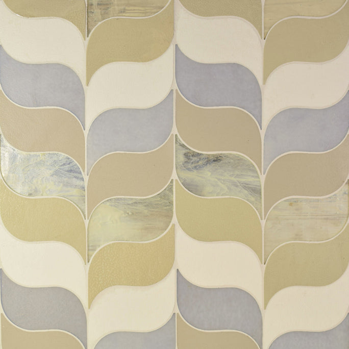 Fused, colored and transparent drawn glass mosaic, obtained with the craftsmanship working of a glass slab with the application of a silver foil back side, waterjet cut. Composed with 25% quality materials, pre-consumer recycled glass and 75% post-consumer recycled glass.