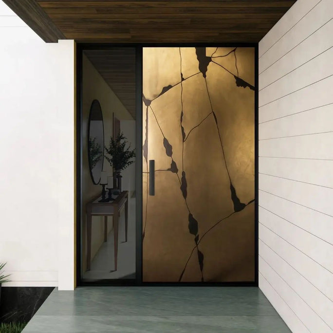 Seen here is a villa entrance crafted using our Crackle Brass door skin.