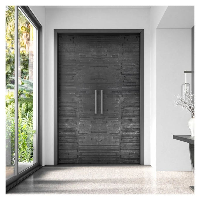 Increase the boldness quotient of your entryways with striking door skin designs. Seen here is our Mattoni door skin in a liquid gunmetal finish.