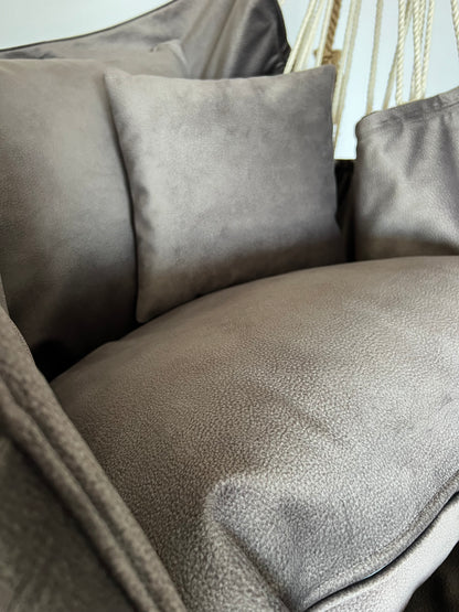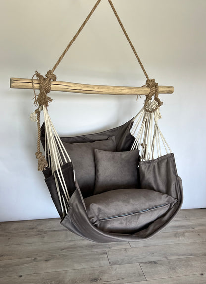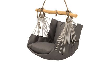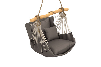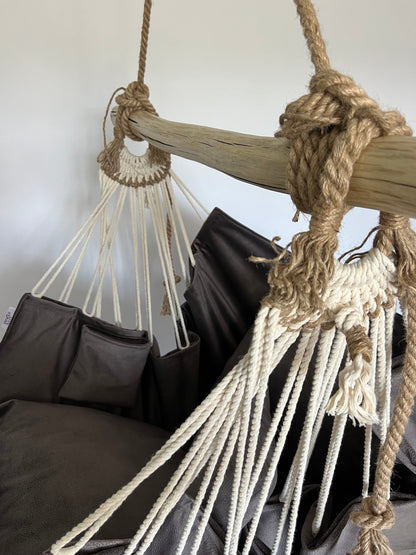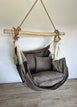 Hammock armchair 2 pillows with the dimensions of approx. 75cm x 75 cm1 removable cover for the 2 pillows1 pillow with the size of approx. 40cm x 40cm 1x 120cm hardwood beam randomly chosen 1x 6m long jute rope.