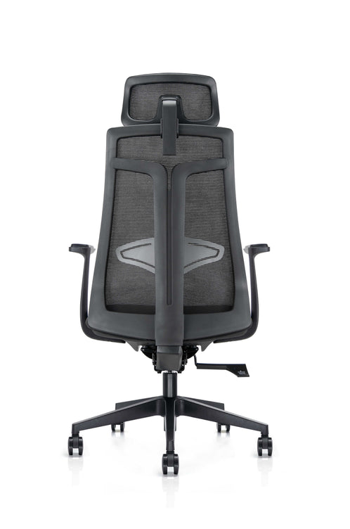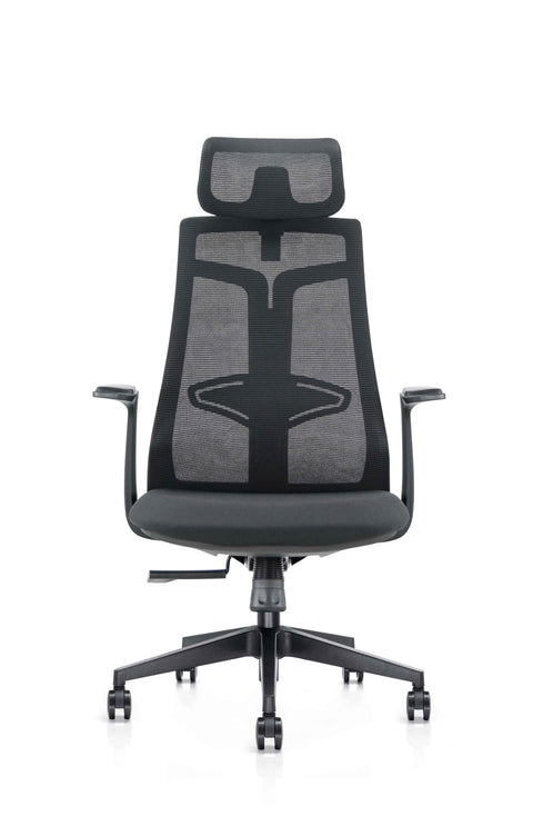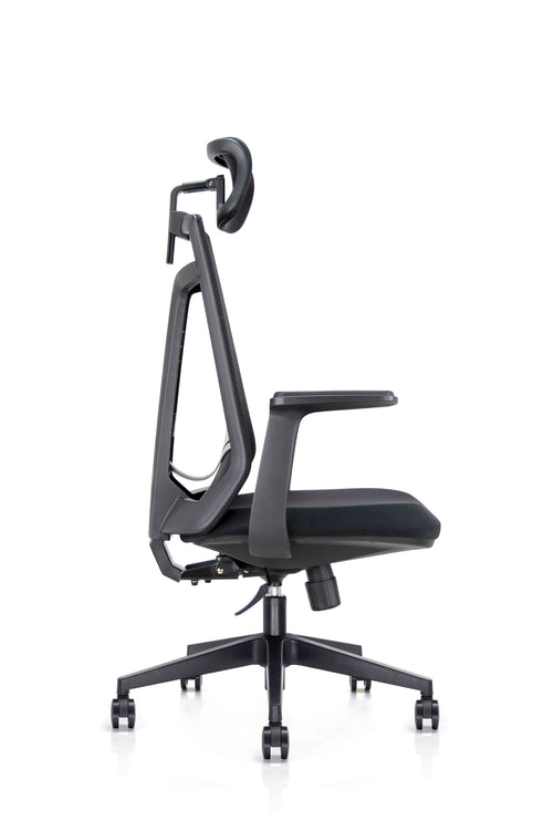HIGH-QUALITY CHAIR IS CONSTRUCTED WITH RELIABLE MESH AND FABRIC, HEADREST AND BACKREST MADE OF BLACK PP (POLYPROPYLENE) NYLON, AND FIBERGLASS, THE HEADREST IS ADJUSTABLE, FIXED ARMRESTS, HIGH-DENSITY MOLDED FOAM WITH A SEAT BOTTOM SHELL, 1-POSITION LOCKING MECHANISM, GAS LIFT IS SGS APPROVED AND BELONGS TO CLASS 3, SUPPORTED BY A ?340MM BLACK NYLON FIVE-STAR BASE AND MOVES SMOOTHLY ON ?60MM BLACK PU (POLYURETHANE) CASTORS.
