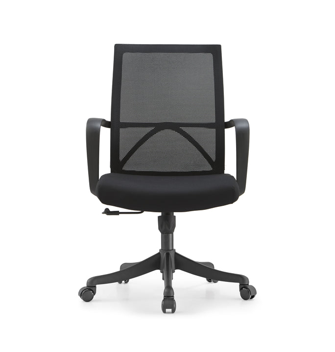 MEDIUM BACK CHAIR WITH MECH AND BACK FABRIC SEAT,WITH FIXED PLASTIC ARMREST,TITL LOCK TENSION MECHANISM, FIVE STAR NYLON BASE AND NYLON CASTERS.