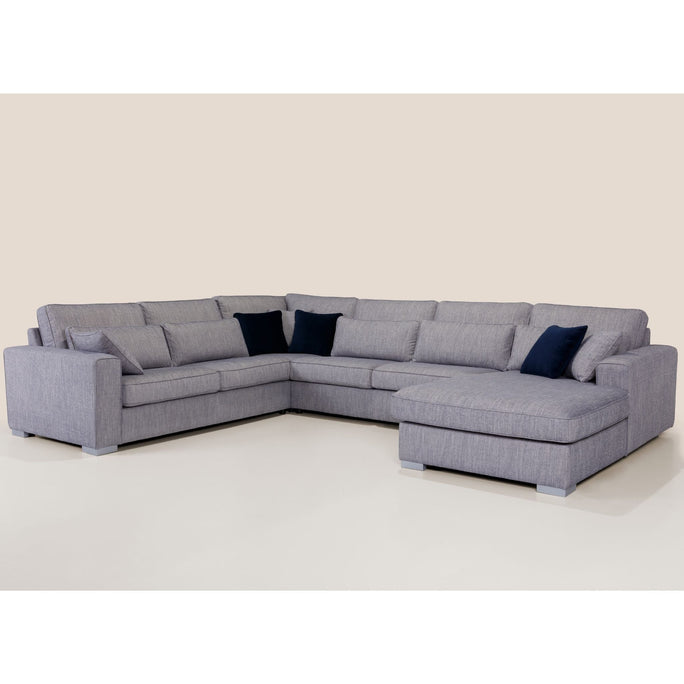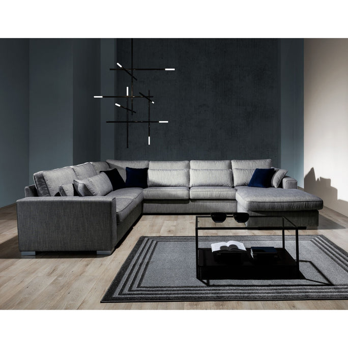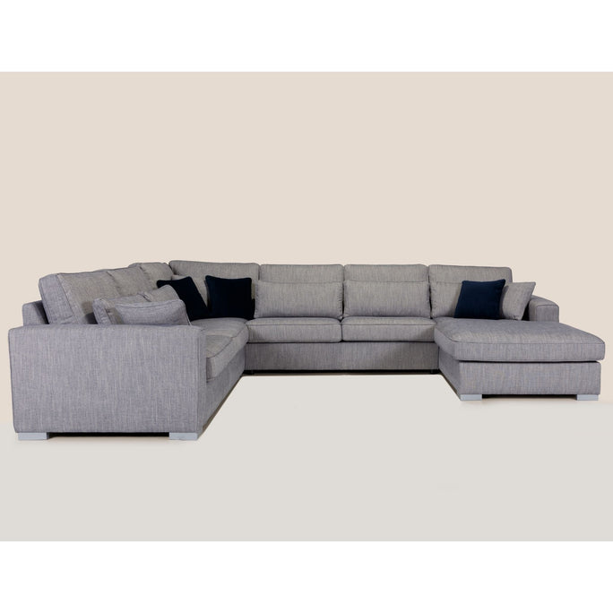 The SOLID U-Shape sofa is distinguished by its timeless and at the same time decorative design. A metal stripboard with a mirror effect is placed in the bottom part of the furniture and on its sides, where it emphasizes the round shape, shiny legs-feet, loose cushions on the backrests – all this creates its own unique image. Subsequent distinguishing features are the U-shaped furniture and above-standard dimensions. The U-Shape sofa is recommended for spacious lounges, where comfort and convenience count the most.