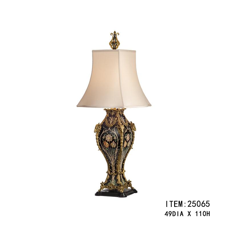 Copper with ceramic fabric table lamp 25065: Porcelain inlaid with copper and gold tracing technology, carefully crafted, the overall curve is smooth and natural, low-key and luxurious, reflecting a noble lifestyle. Thick metallic copper, simple and natural ceramics and the organic combination of the two elements, hand-painted pictures, beautiful and exquisite. The base of the product is carefully carved into a fancy base with complex and fine patterns and clear lines. The copper parts after post-processing have a more stable temperament.