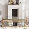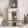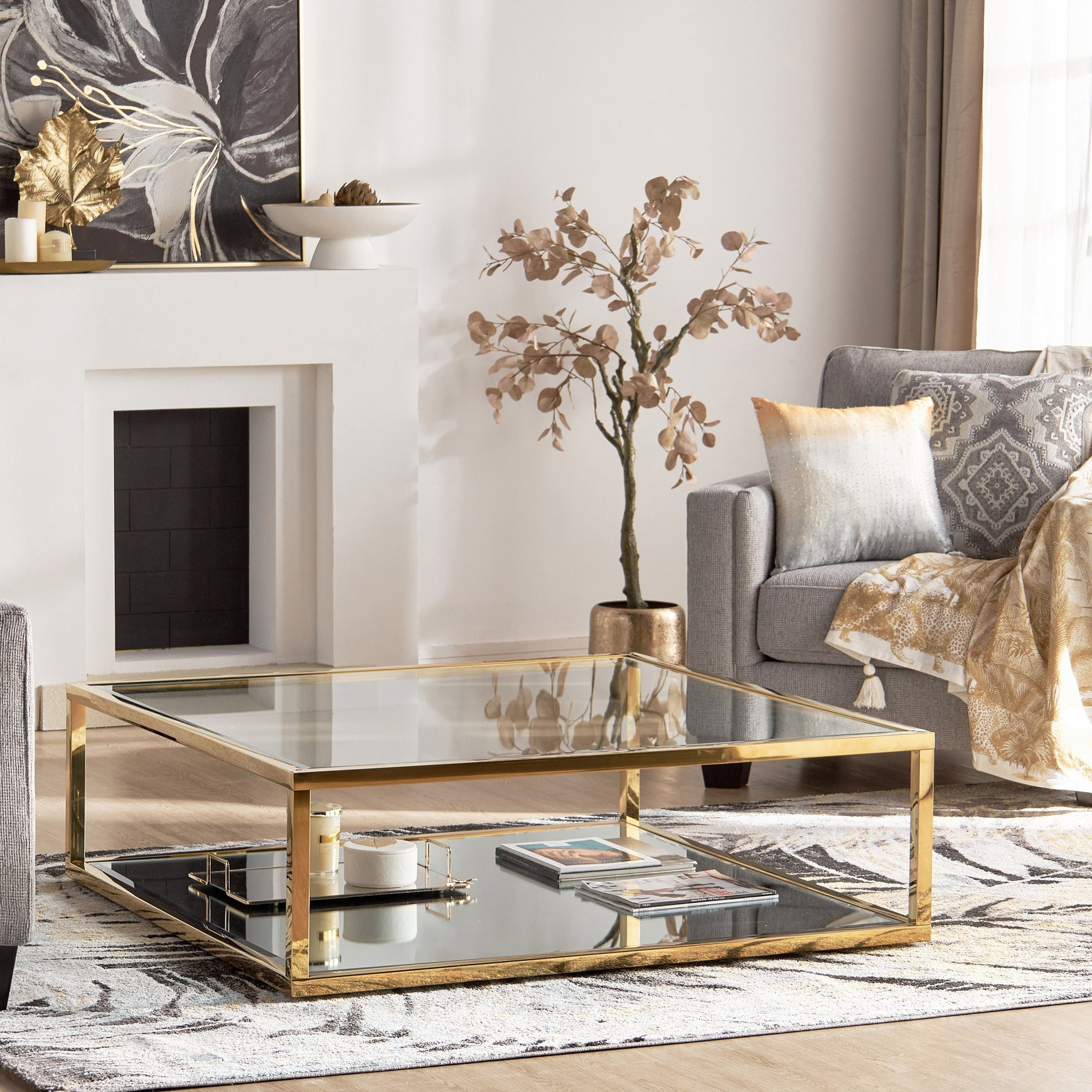 Designed for relaxed comfort, Atrisa Glass Top Coffee Table layers gentle texture and a refined look into your space. Product description: Square, large-format coffee table with tempered glass top, stainless steel legs, and a lower shelf for display or storage. Modern luxe style.