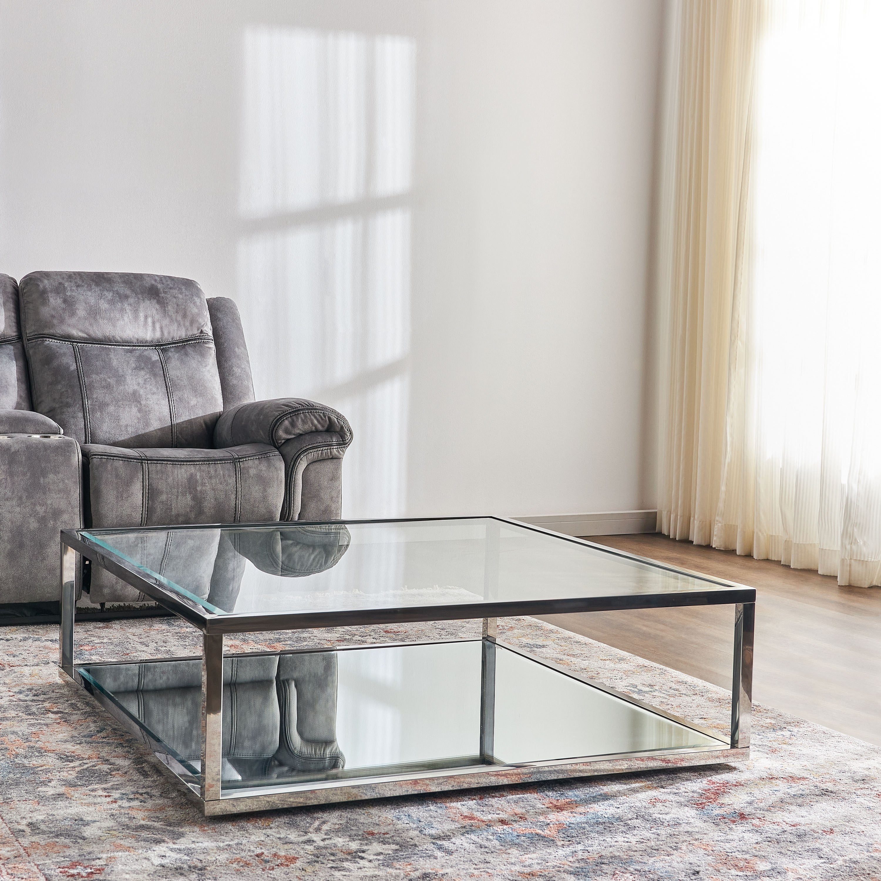 Designed for relaxed comfort, Atrisa Glass Top Coffee Table layers gentle texture and a refined look into your space. Product description: Square, large-format coffee table with tempered glass top, stainless steel legs, and a lower shelf for display or storage. Modern luxe style.