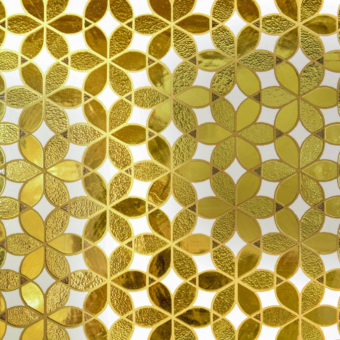 Fused, colored and transparent drawn glass mosaic, obtained with the craftsmanship working of a glass slab with the application of a silver foil back side, waterjet cut. Composed with 25% quality materials, pre-consumer recycled glass and 75% post-consumer recycled glass.