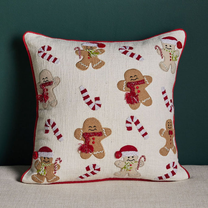 45 × 45 cm; embroidered gingerbread motif; filled insert; cotton-blend cover