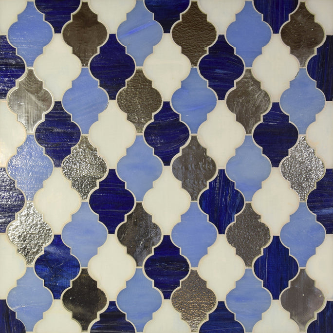 Fused, colored and transparent drawn glass mosaic, obtained with the craftsmanship working of a glass slab with the application of a silver foil back side, waterjet cut. Composed with 25% quality materials, pre-consumer recycled glass and 75% post-consumer recycled glass.