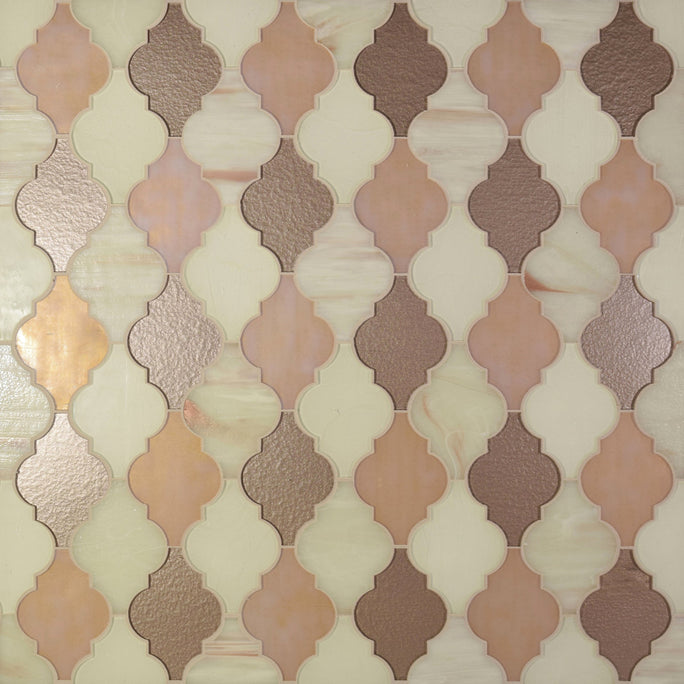 Fused, colored and transparent drawn glass mosaic, obtained with the craftsmanship working of a glass slab with the application of a silver foil back side, waterjet cut. Composed with 25% quality materials, pre-consumer recycled glass and 75% post-consumer recycled glass.