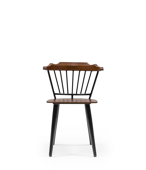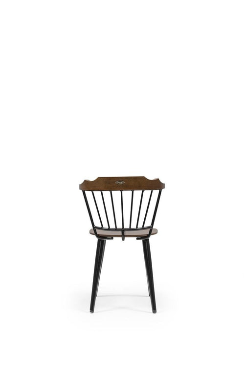 Dark wooden seat/back | Black spindle backrest | Sturdy minimalist style | Straight tapered legs | Durable café/dining chair